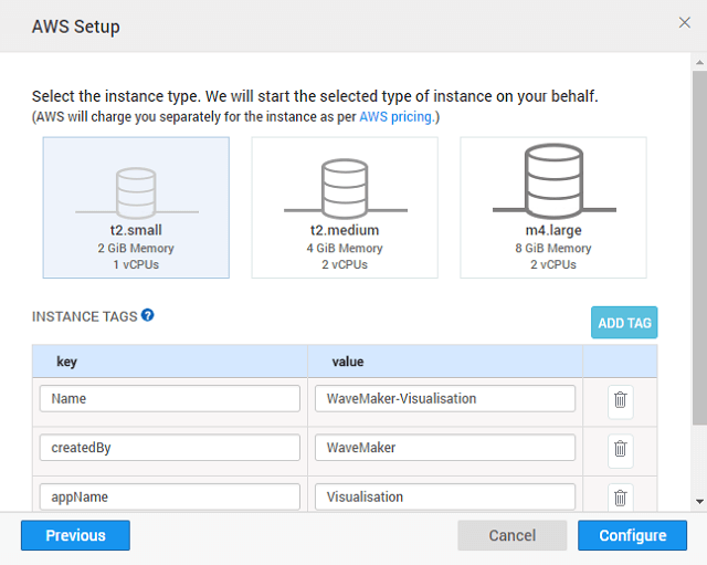 • Select the appropriate instance size based upon the resources and database utilized by your app and enter the key-value instance tags (see here for best practices for instance tagging)