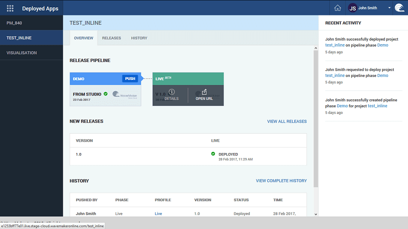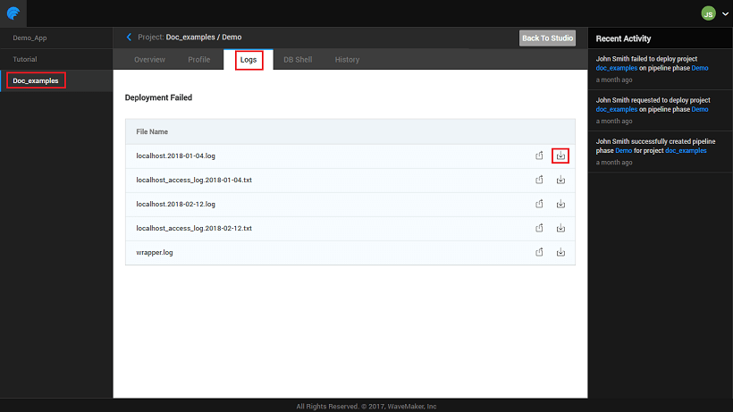 In case you want to debug deployed apps or to send logs for the deployed app to WaveMaker support team you might have to download the logs for deployed apps. In such cases