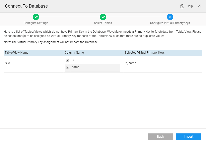 When connecting to an external Database, if the tables do not have Primary Key, you will be given an option to assign a Virtual Primary Key.