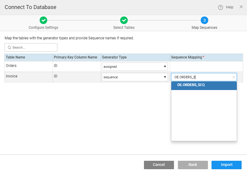 For databases that support sequences (Oracle, SQL Server, PostgreSQL, DB2, etc.) for the Primary Key generation, the mapping of Primary Key columns to the respective Sequences can be done at the time of connecting to Database.