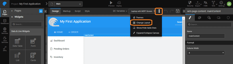 Similarly for Mobile apps, each page can be designed by selecting an appropriate layout and arranging widgets in it. For more information, see Hybrid Mobile Page Layout.