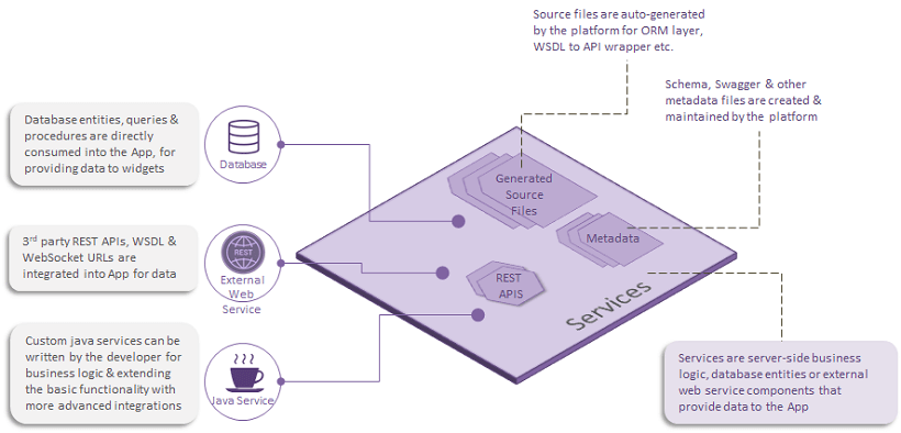 A WaveMaker App is built in 3 layers, i.e. front-end UI layer, binding layer and the backend services layer. Apps can be built using model-first approach and generating the needed backend services and then composing the User Interface. Alternatively, UI widgets can be put together as a template and later be bound to the backend services to complete the business logic flows.