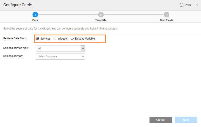 The first step in configuring a card is to define the data that needs to be displayed. This data can be in the form of a Variable or another Widget.