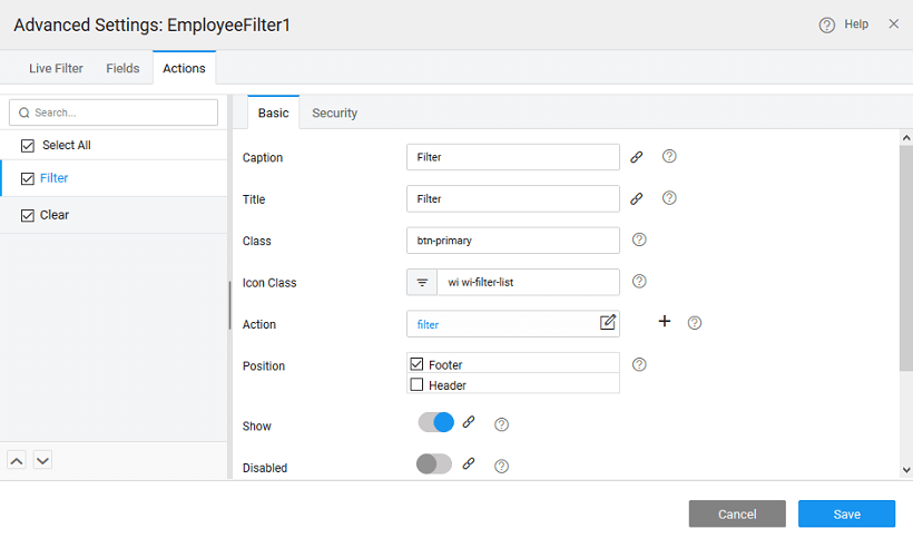 Actions to be performed can be mentioned from the Actions tab, by default filter and clear buttons are provided. You can add custom actions to your filter. Multiple events can be triggered by a given action. Note: If a custom column/action is not selected, it will be deleted when the Filter Designer is saved.