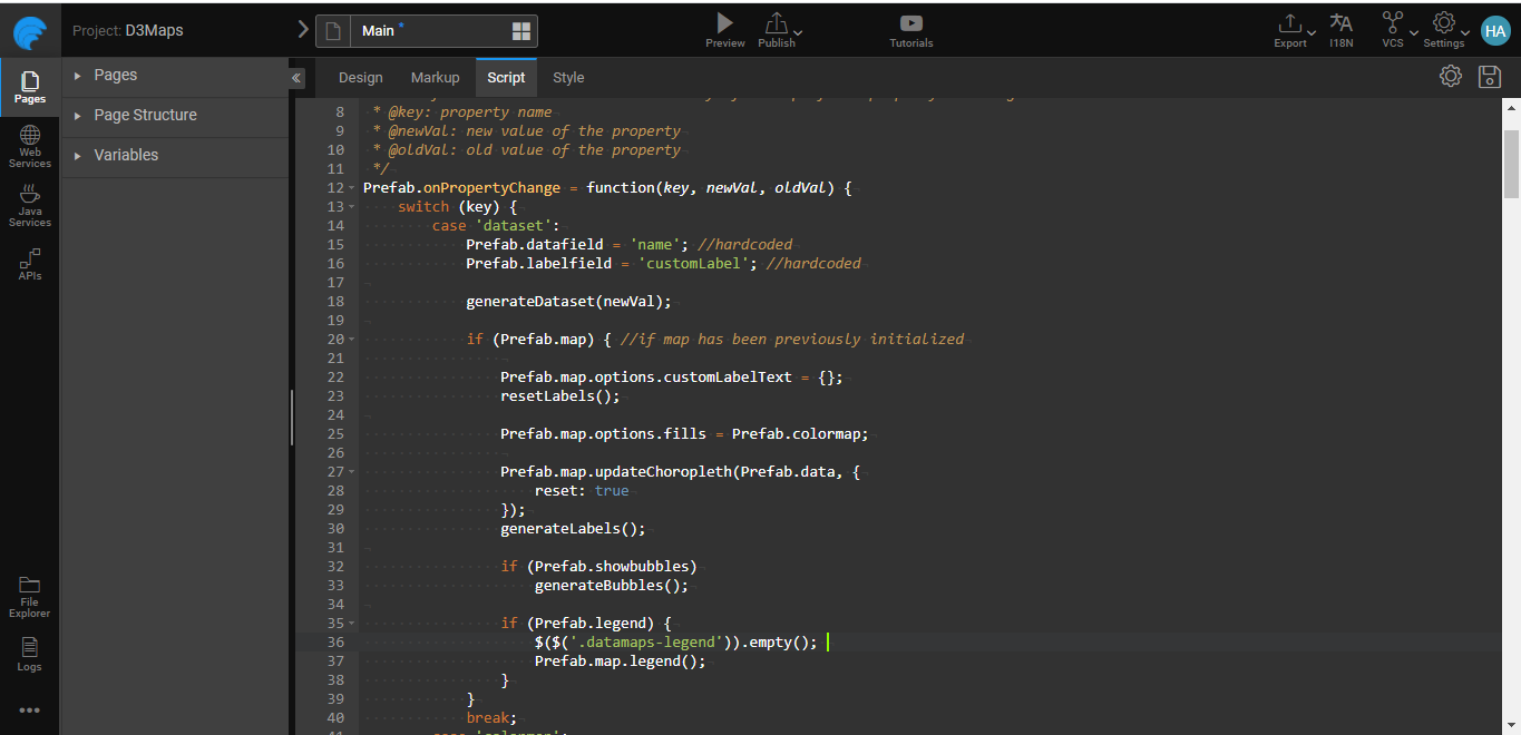Go to the Script tab, and add the following lines code which adds new functions; these functions were referenced in the example-code above. It adds additional ability to display the label and bubbles on the Datamaps Prefab.