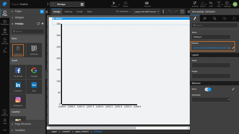 D3 allows you to bind arbitrary data to a Document Object Model (DOM), and then apply data-driven transformations to the document. For example, you can use D3 to generate an HTML table from an array of numbers. Or, use the same data to create an interactive SVG bar chart with smooth transitions and interaction. The chart widgets which are offered by WaveMaker are based out of NVD3 charts, which are re-usable charts for D3 charts. and as such implementing any of the NVD3 & D3 charts becomes easy. Here we will see two simple examples - line chart (D3) and line plus bar chart (NVD3).