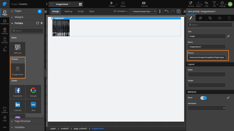 - Open/Create a project to see the usage of the above Prefab. Import the Prefanb from Artifacts listing dialog. Drag and drop the Imageviewer onto the canvas.