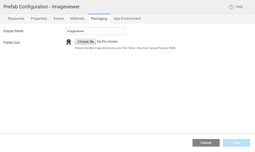- You can set the group and icon to be associated with the Prefab from the Packaging section. This will be displayed in the Widget toolbox of the apps after Publishing the Prefab (next section).