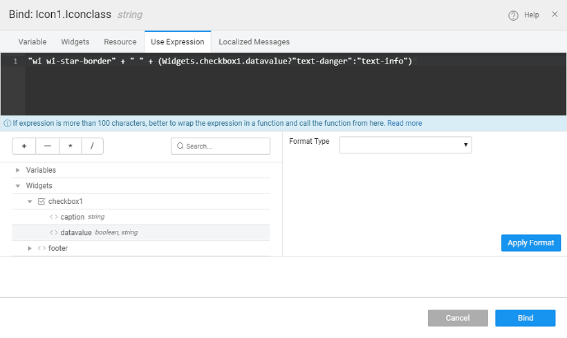 1. Click on the Icon widget and for the "Icon Class" property click on the bind icon.