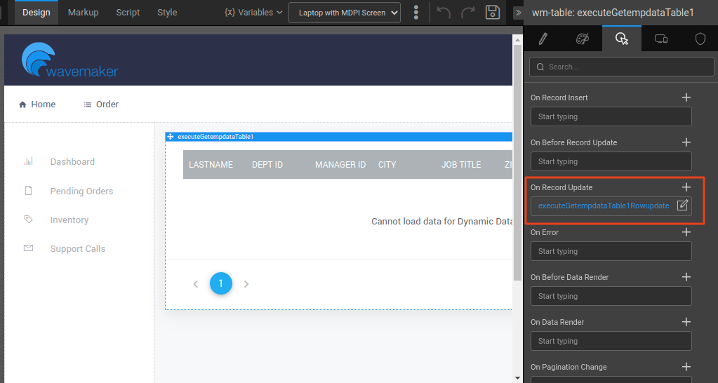 - Ensure to click the Data Table and navigate to the Events tab from the Properties panel. Go to the On Record Update event, and select Javascript from the dropdown.