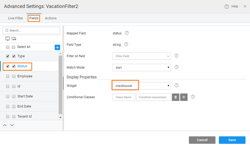 1. Set the Widget Display Property for Status field to Checkboxset.