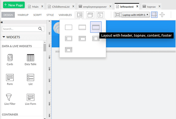 - For the Main page, choose the Layout with header, topnav, content and footer.