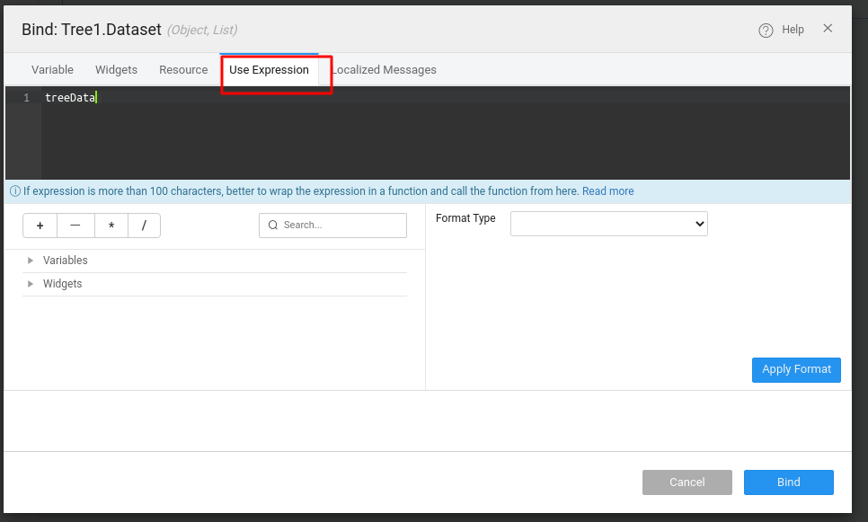 1. Select the Tree widget. Go to Value property and click the bind icon under the Dataset section. Go to the Use Expression tab and set the script variable as treeData.