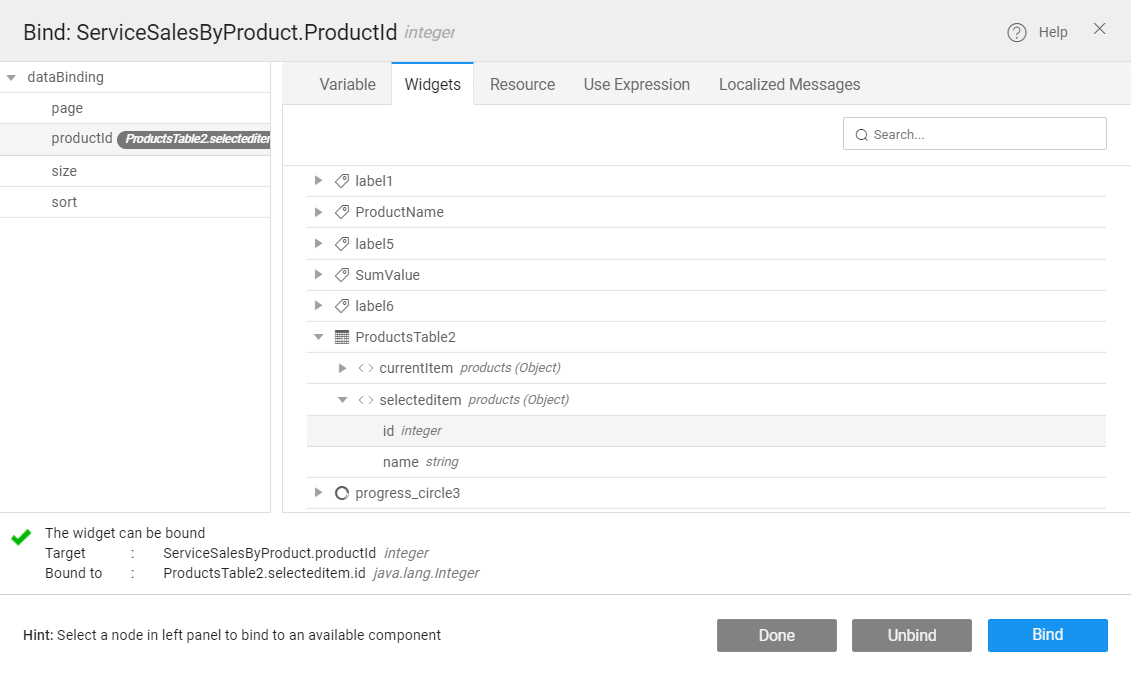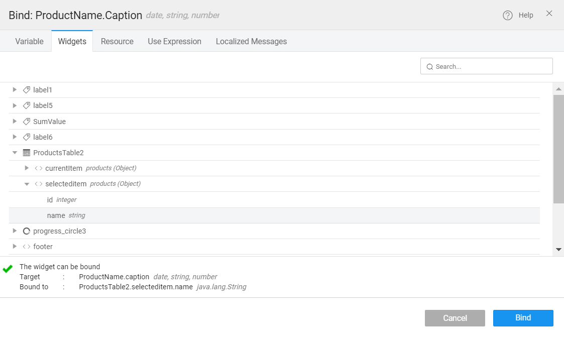 • From the Widgets tab, select ProductTable2 → selecteditem → name. See image below: