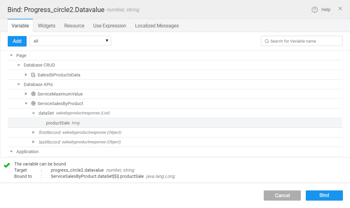 • Set the Default Value; for example, enter any number for a static value. For dynamic update, bind the Default value with the variable called Service SalesByProduct.dataSet[$i].productSale.