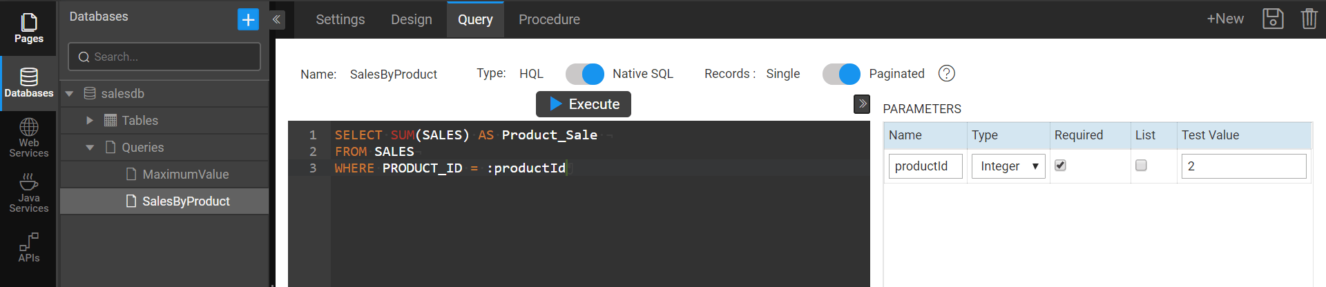 7. Select the Query from the drop-down. For example, executeSalesByProduct.
