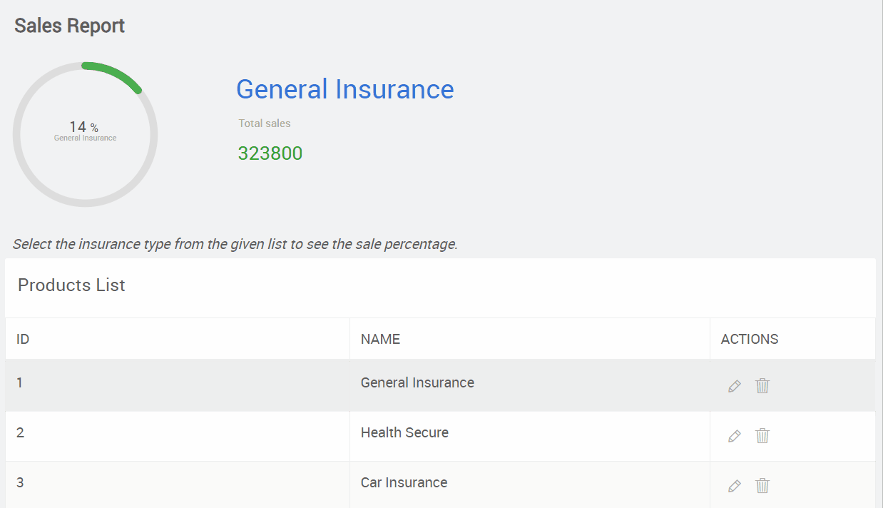 Click the Preview icon to view the page. When you click on each table item, the product sale value displays on the progress circle widget. Also, on the right side of the progress circle, you will see the item name and total sale value.