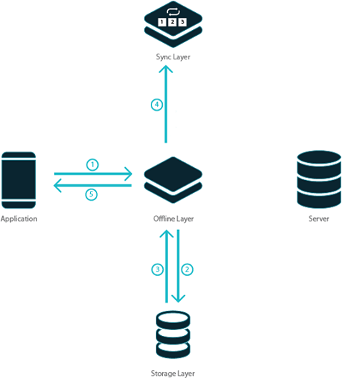 The offline layer intercepts all data requests. When the app is online, it forwards the request to the server and receives the responses from the server. When the app is offline, it consumes the request and provides the response. The offline layer includes: