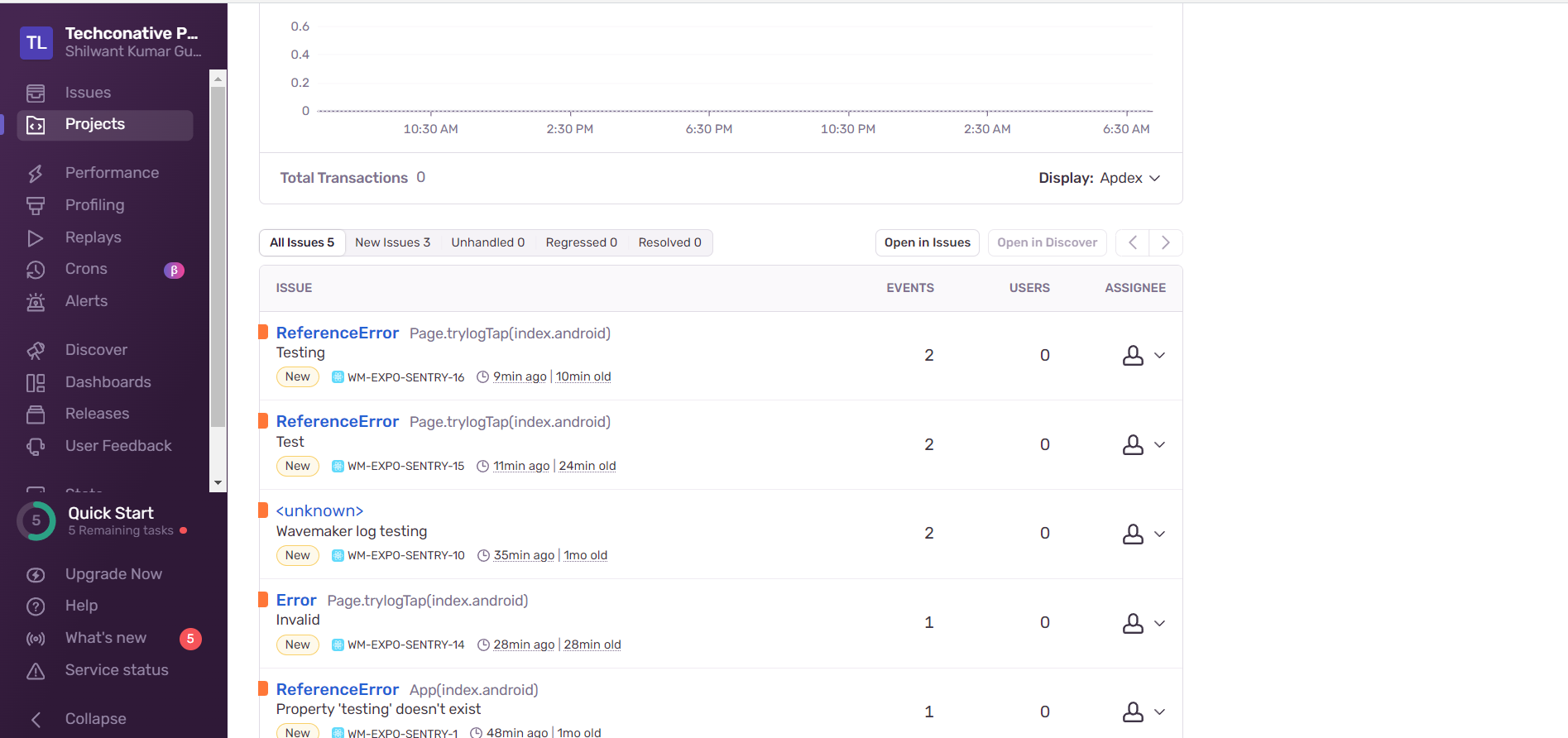 • Once you selected appropriate project, you can see captured errors, exceptions, and crash reports.