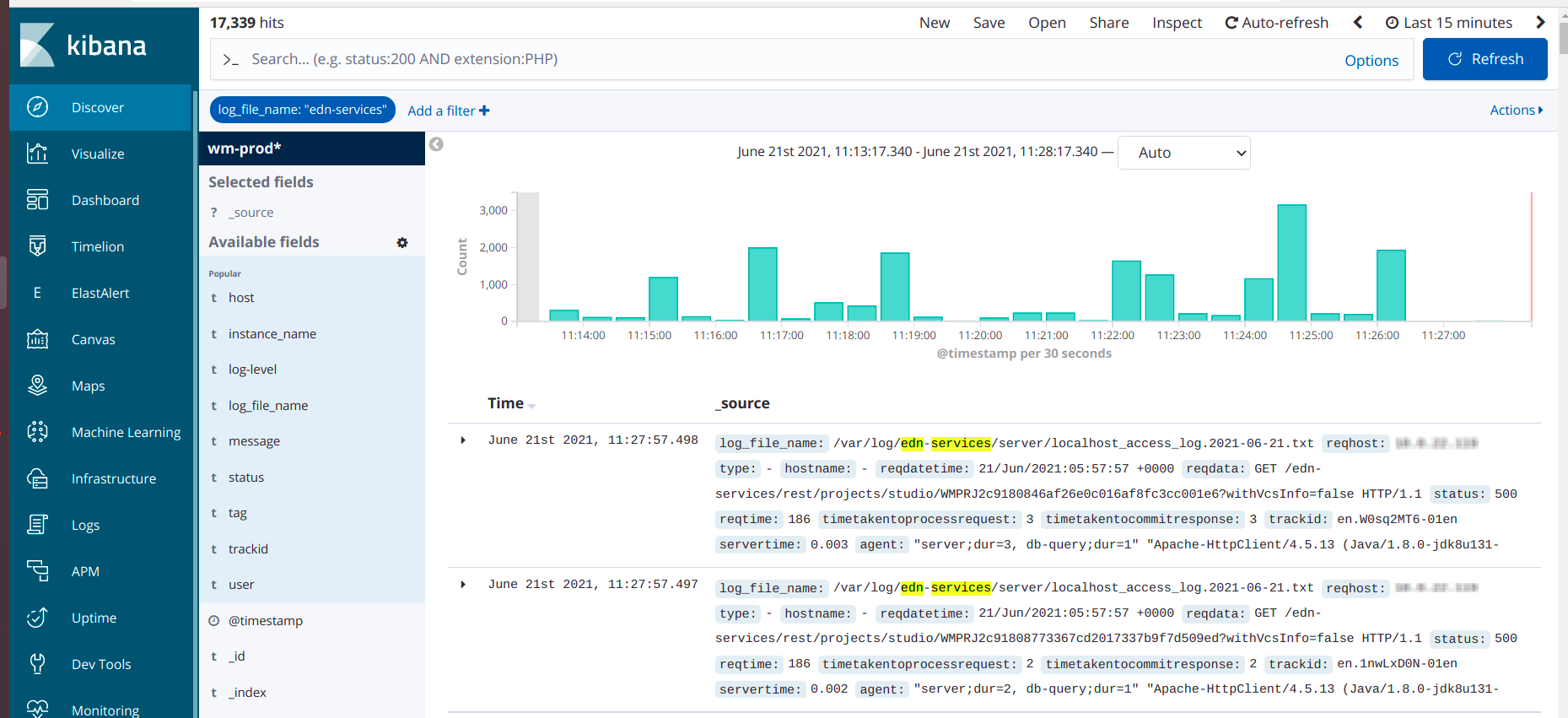 • Select Discover from the Kibana and add the Filter by selecting log_file_name as edn-services.